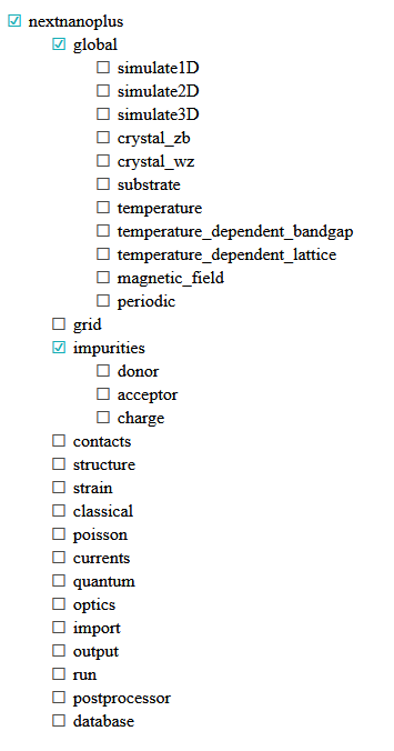 Figure 1.3.3 Example keyword tree for a version of the nextnano++ tool.