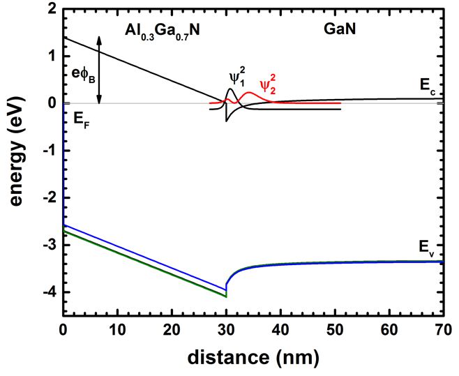 probability densities of the two lowest subbands of a 30 nm Al0.3Ga0.7N