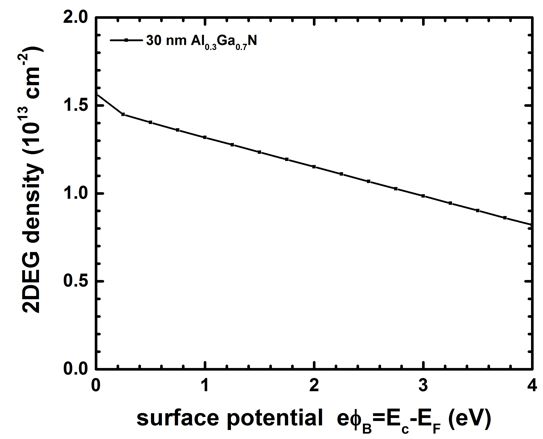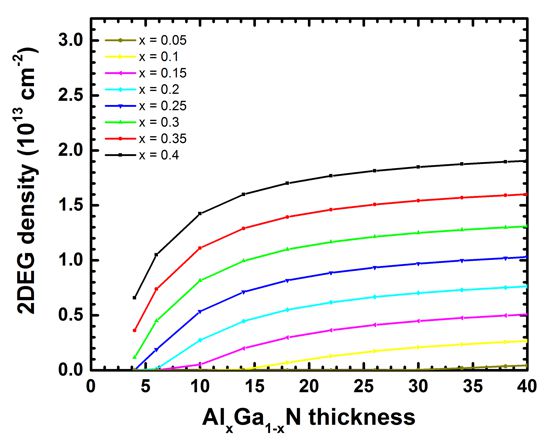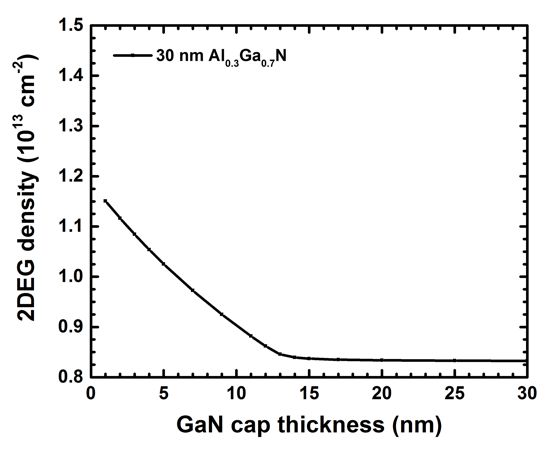 The following figure shows the 2DEG density vs. GaN cap layer thickness for a 30 nm Al0.3Ga0.7N