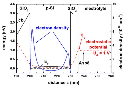 Conduction band edge and electron densitySince we have specified all about the sensor and the proteins in the electrolyte, we are now ready to calculate the electrostatic potential in the semiconductor/electrolyte system for several protein charge distributions. The quantum mechanical charge densities are calculated self-consistently by solving the Schrödinger equation in the silicon channel. The Schrödinger and Poisson equations are coupled via the electrostatic potential and the charge densities. Figure 2 shows the calculated conduction band