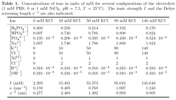For the ionic content of the electrolyte we consider a variable concentration of KCl (i.e. 10, 50, 90 or 140 mM), and a fixed concentration of 1 mM NiCl2 and 1 mM of phosphate buffer saline (PBS) solution, respectively. The NiCl2 dissociates into 1 mM of doubly charged cations and 2 mM of singly charged anions. For all calculations, the pH of the bulk electrolyte has been set to 7.5.