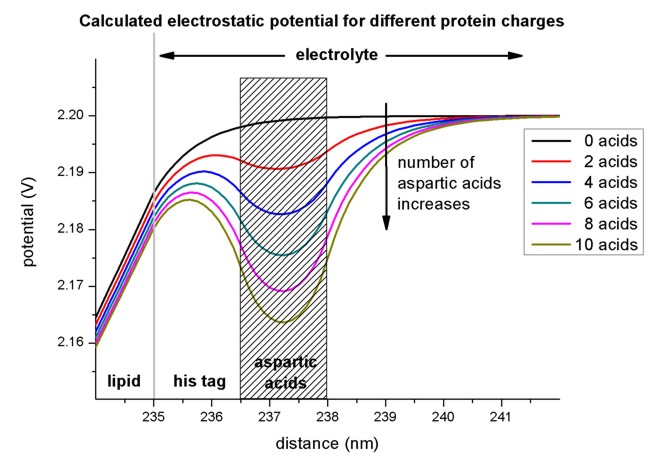 Electrostatic potential for different numbers of aspartic acidsWe calculated the potential and charge distributions in the semiconductor/electrolyte structure self-consistently for different numbers of aspartic acids. Importantly, variations of the protein charge distribution that affect the potential in the SOI structure are calculated. Since the potential at the lipid/electrolyte interface sets the boundary value for the spatial potential distribution in the semiconductor, we determine the lipid/electrolyte interface potential and its changes as a function of the respective parameter that is varied. The interface potential is also referred to as the surface potential since the lipid layer constitutes the surface of the semiconductor. The magnitude of the negative protein charge density increases with the number of aspartic acids. This results in a lower potential in the protein region. Fig. 3 shows the calculated potential distribution for a varying number of aspartic acids where the surface potential decreases with increasing protein charge. The pH value of the electrolyte has been set to 7.5 and the concentration of KCl in the solution has been assumed to be 140 mM. As already mentioned, the neutral part of the histidine tag is assumed to be 1.5 nm. The respective protein charges that are considered have been homogeneously distributed over 1.5 nm and are indicated by the shaded region in Fig. 3. We have considered the chemical structure of the histidine tagged amino acids in order to obtain this parameter. We note, that the electrolyte region starts at the lipid surface at 236 nm. Now we want to plot the electrostatic potential for different numbers of aspartic acids.