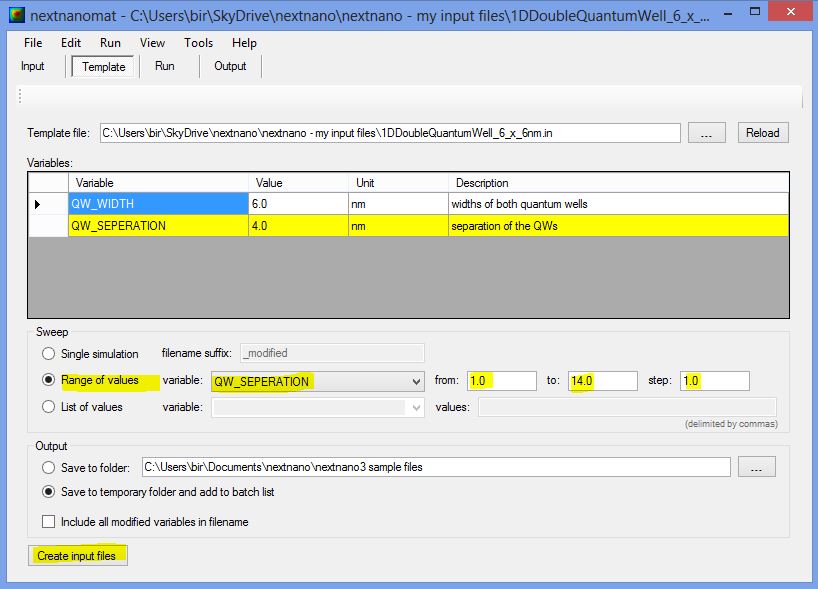 "QW_SEPARATION", click on "Create input files", go to "Run and start your