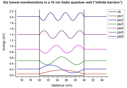 The figure shows the six lowest eigenfunctions of the 1D GaAs quantum
