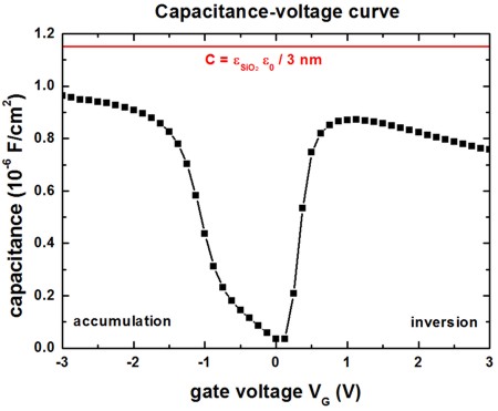 The following figure shows the C-V curve again for the 3 nm SiO2