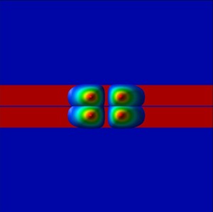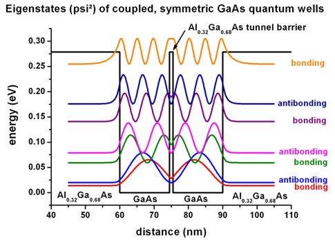 The following figure shows the confined eigenstates Ez of the coupled, symmetric QW system (1D simulation along the z direction).