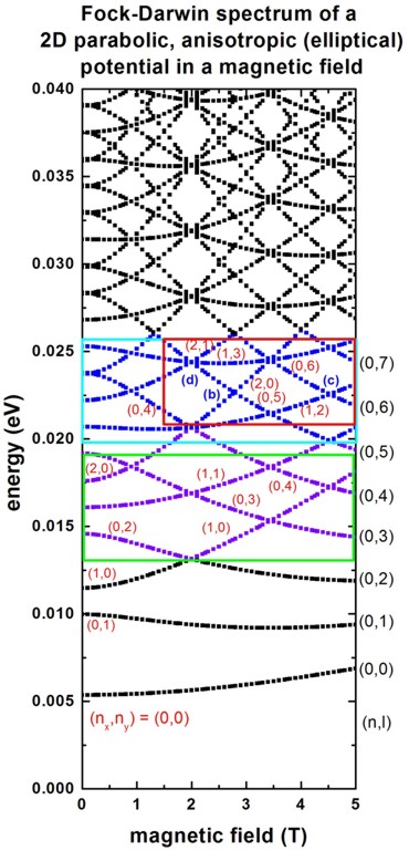 The following figure shows the calculated Fock-Darwin-like spectrum, i.e. the eigenstates as a function of magnetic field magnitude.