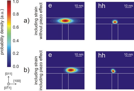 The following figure shows the square of the electron (e) and heavy hole (hh)