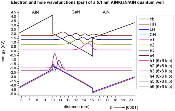 The following figure shows the electron and hole wave functions (psi²) in a 5.1 nm AlN/GaN/AlN quantum well. For the electrons, the single-band effective-mass approximation was used whereas for the holes the 6-band k.p model was used. The figure shown the four lowest electron eigenstates and the 6 highest valence band eigenstates. All eigenstates are two-fold degenerate due to spin.